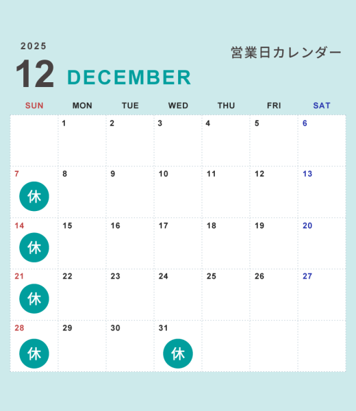 2025.11.27 お知らせ 12月の営業日および営業時間変更のお知らせ いつもシルクハウスをご利用いただき、誠にありがとうございます。 12月1日より、営業時間を下記の通り変更させていただきます。 〈変更前〉 8:30~19:00 〈変更後〉 8:30~18:30 あわせて、12月の営業日につきましては、 下記カレンダーをご確認ください。 お客様にはご不便をおかけいたしますが、 何卒ご理解賜りますようよろしくお願い申し上げます。