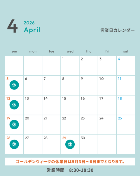4月営業日のお知らせ